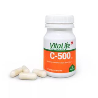 Vitalife c 500 mengandung 30 kaplet vitamin c dengan takaran sebesar 500 mg.